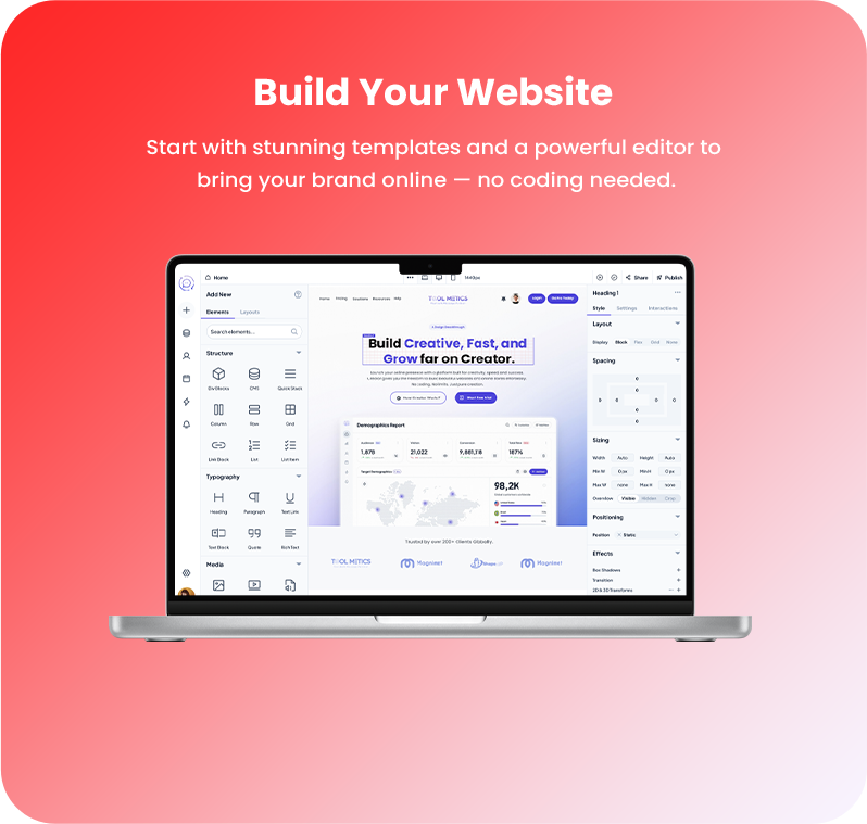 Launch your online presence with a platform built for creativity, speed, and success. Buildor gives you freedom to build beautiful websites and online stores effortlessly. No coding. No limits. Just pure creativity and growth.
